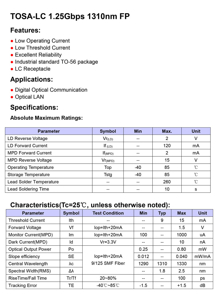 Iop=Ith+20mA 9/125 SMF Fiber |